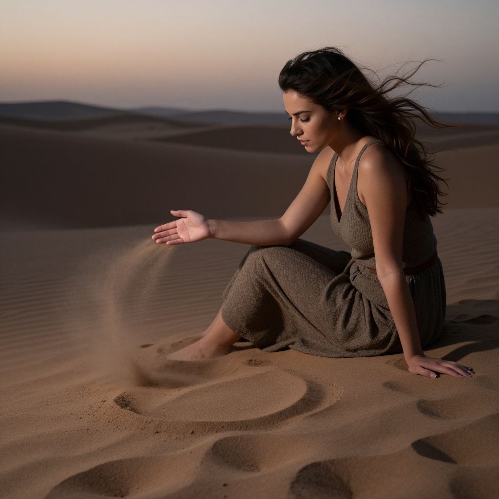 Woman made out of sand sitting in desert at dusk and staring down at her hand as it slowly blows away into the wind. high quality, ultra detail, artistic lighting, artistic, award winning photo,