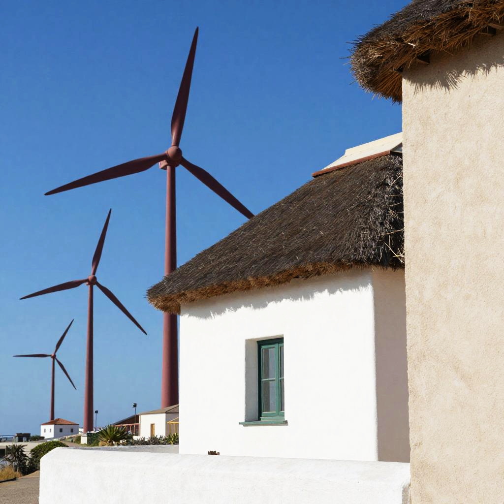 This image is a photograph of a sunny, coastal scene featuring a white-washed building with a thatched roof on the right side. In the background, there are tall, red wind turbines with long blades standing against a clear, bright blue sky. The building has a small, rectangular window and is adjacent to a beige, stucco wall on the far right. The sunlight casts sharp shadows, highlighting the textures of the thatched roof and wind turbines.
