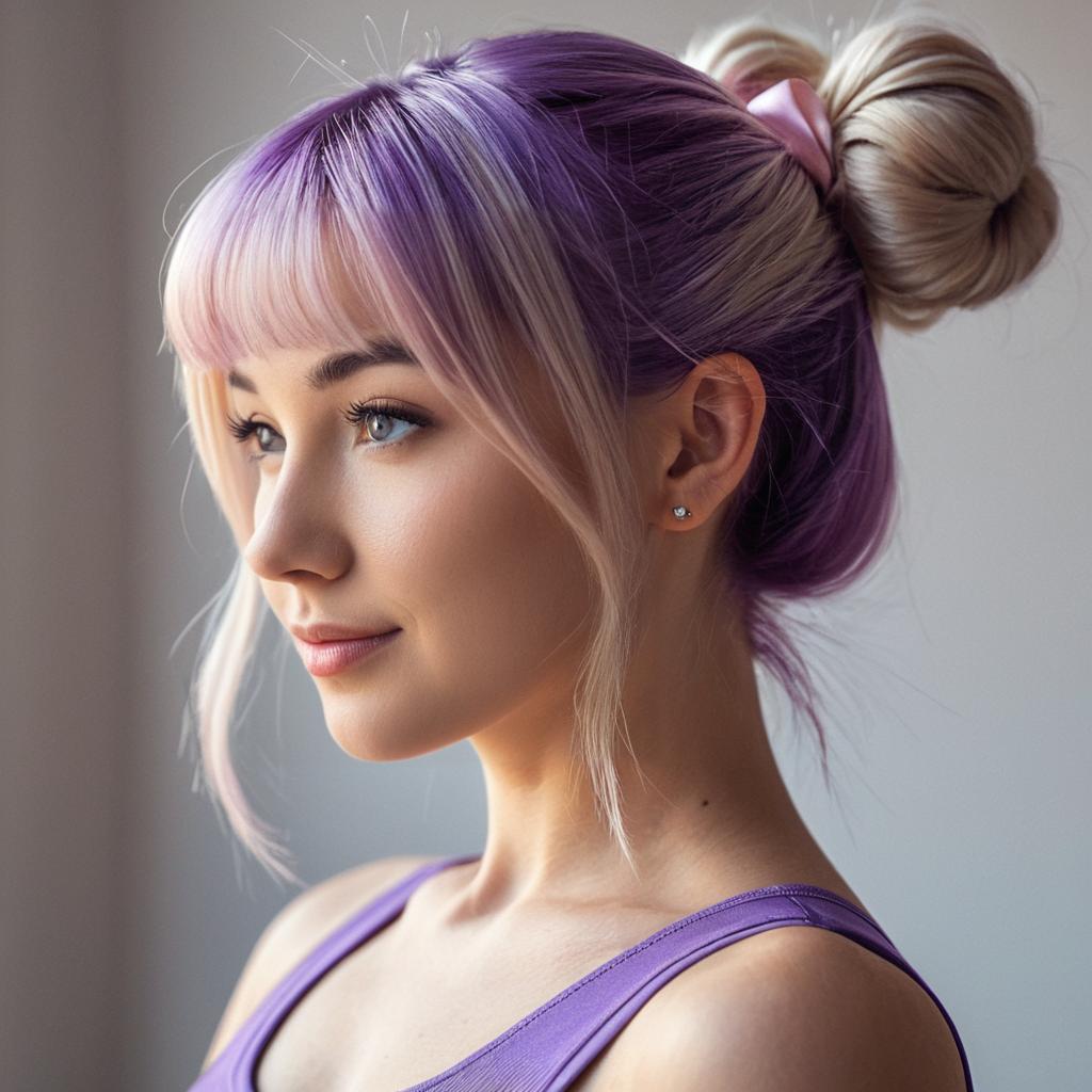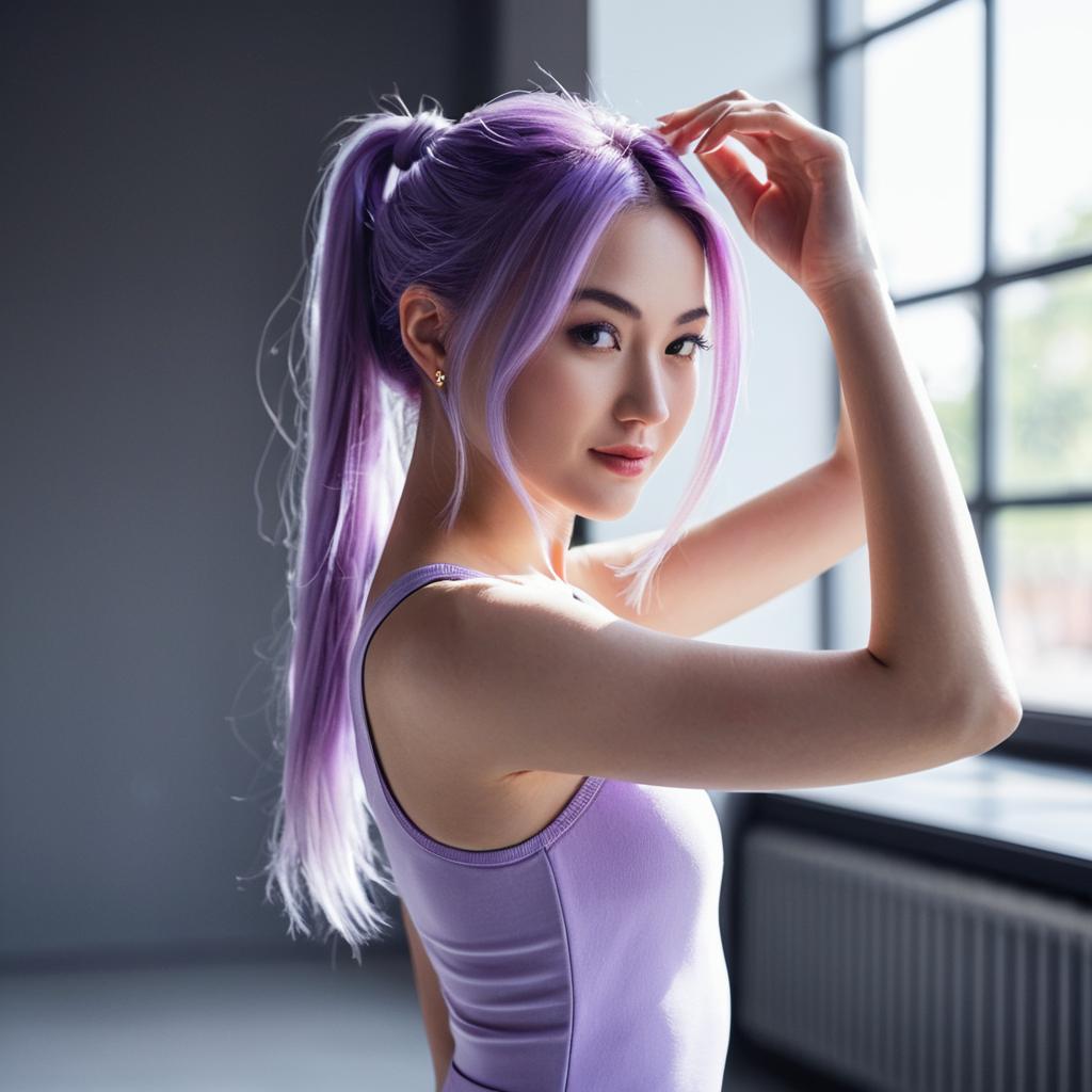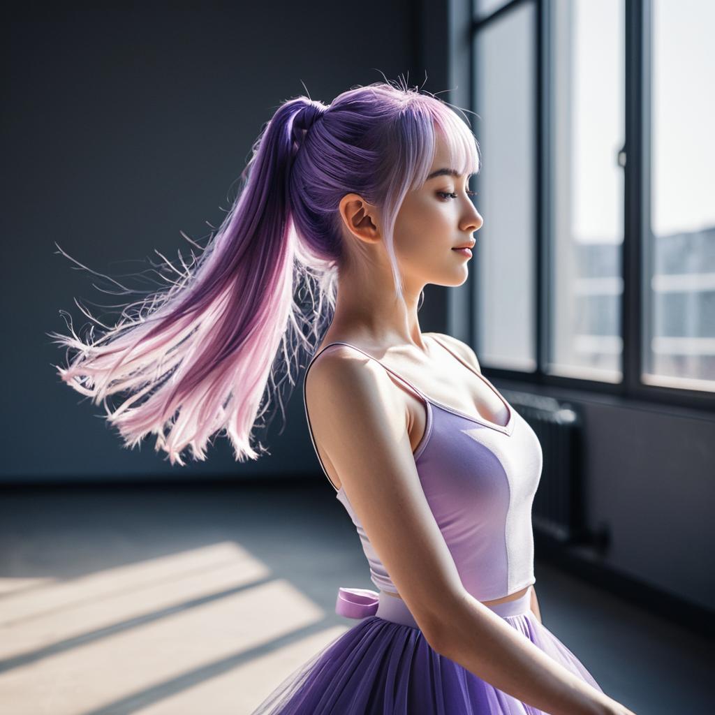 Graceful poised female dancer, Close-up realistic natural hdr photo a new artwork by SakimiChan, elegant dancer with long light lavender hair as aesthetic, e-girl, cosplay cute, adorable, purple - pink hair, warmth, mood, female, tiktoker, 2023 fashion, sleek tied back 2023, flowing 2023 ballet apparel, confident, little smile + realistic natural colour grading + realistic natural lights + realistic natural colours + photo taken by arri + photorealism, extremely photorealistic + accurate proportions + incredibly details, sharpen, details + extremely meticulously designed environment + bright glorious summer sunshine + 100mm + octane rendering + lightroom, behance photography, unsplash, Photorealism.