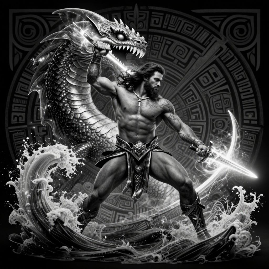 A colossal stone giant stands serenely amidst a misty landscape, its massive form dwarfing a sprawling city nestled beneath its armpits, where spires and towers rise like inverted reflections in a dreamlike, monochromatic world.