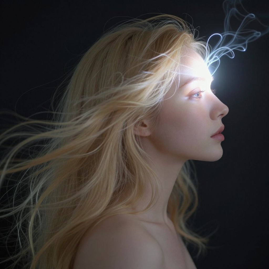 A digital artwork featuring a side-profile portrait of a woman with flowing blonde hair, illuminated by ethereal tendrils of light emanating from her forehead, evoking a surreal and introspective mood reminiscent of long-exposure photography.