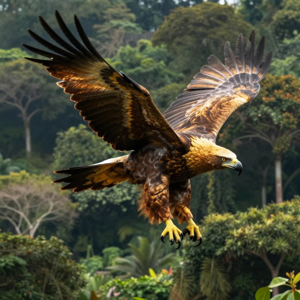Humanoid eagle in dynamic flight pose above dense jungle canopy, feathers detailed with golden-brown hues, muscular humanoid form, cinematic lighting, epic atmosphere