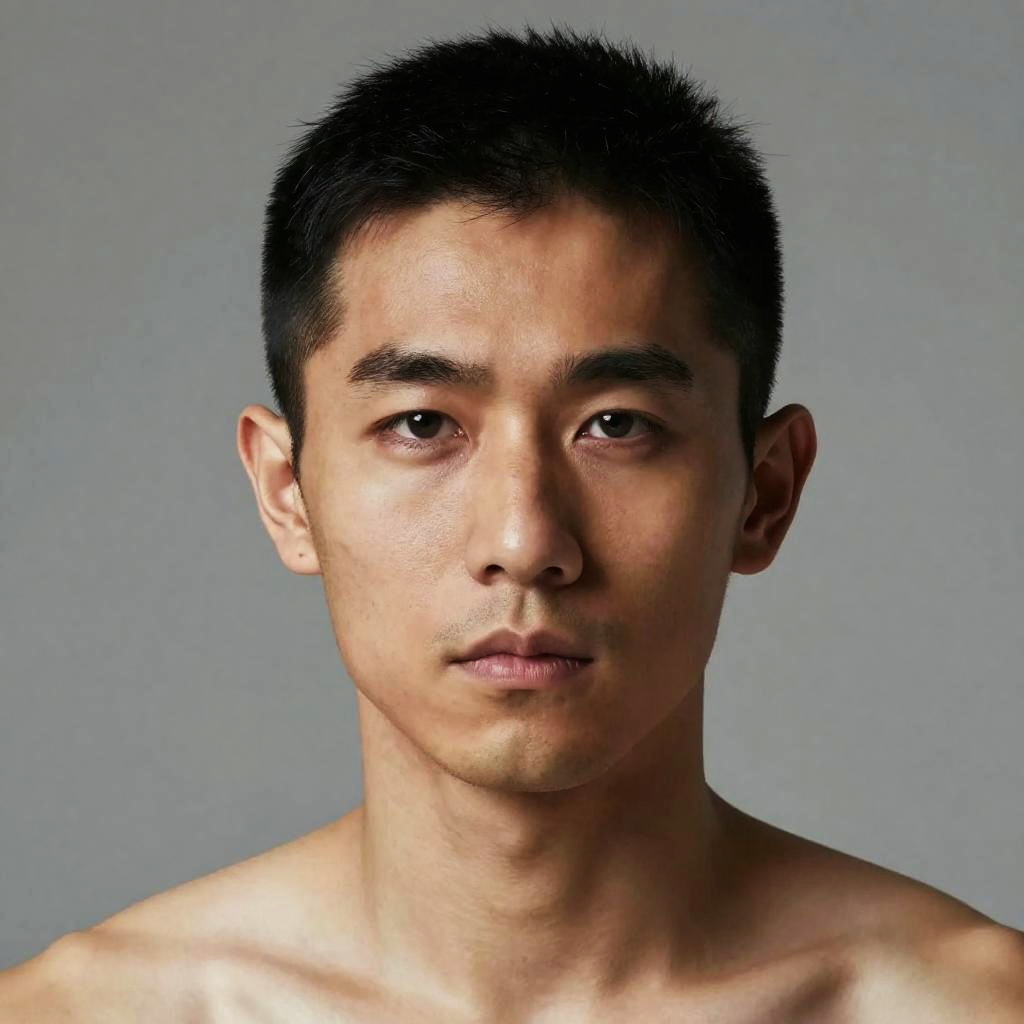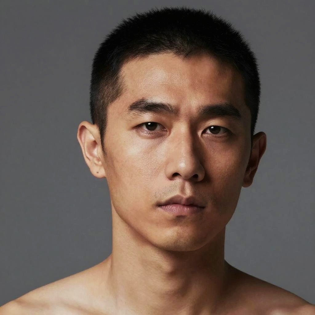 (masterpiece:1.1), best quality, (photorealistic:1.2), hyperrealistic, award-winning portrait of adult man, close-cropped jet black hair, serious expression, upper body, expressive eyes, slim wai
