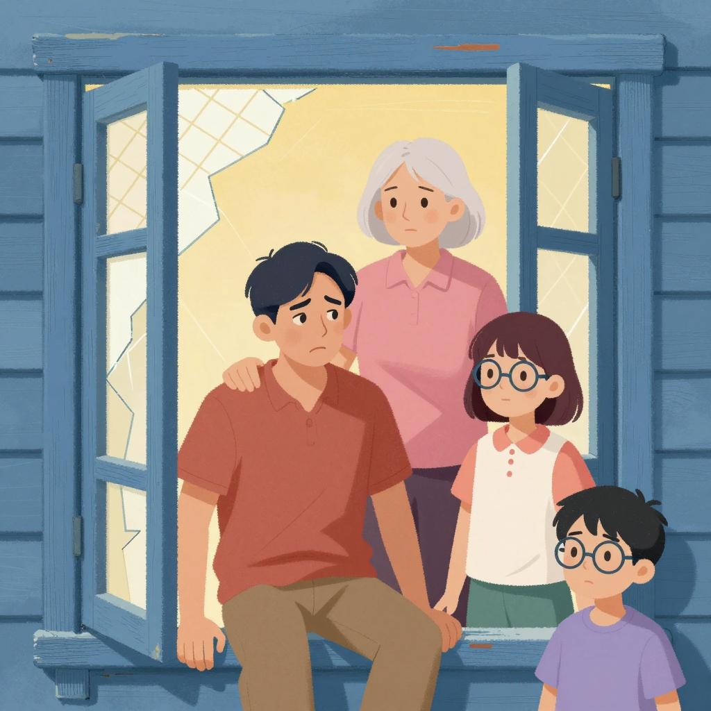 Illustration of a family in front of a broken, blue wooden window with yellow, diamond-patterned glass. A middle-aged woman with white hair in a pink shirt stands behind a man in a red shirt, who sits on the window frame. A young girl with dark hair and glasses, wearing a pink and white blouse, stands to the right. A younger boy with glasses, in a purple shirt, sits in the bottom right corner. The man has a worried expression. The background includes splintered wood and a blue exterior.