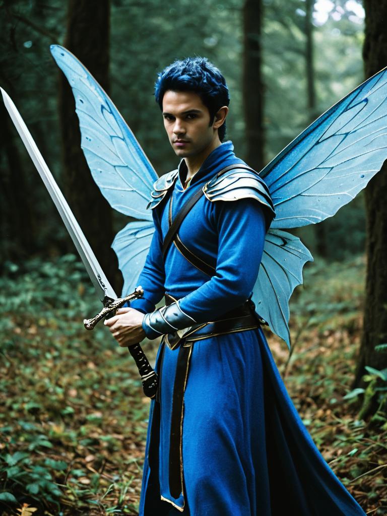 Male Fairy, male in a blue costume with wings and a sword