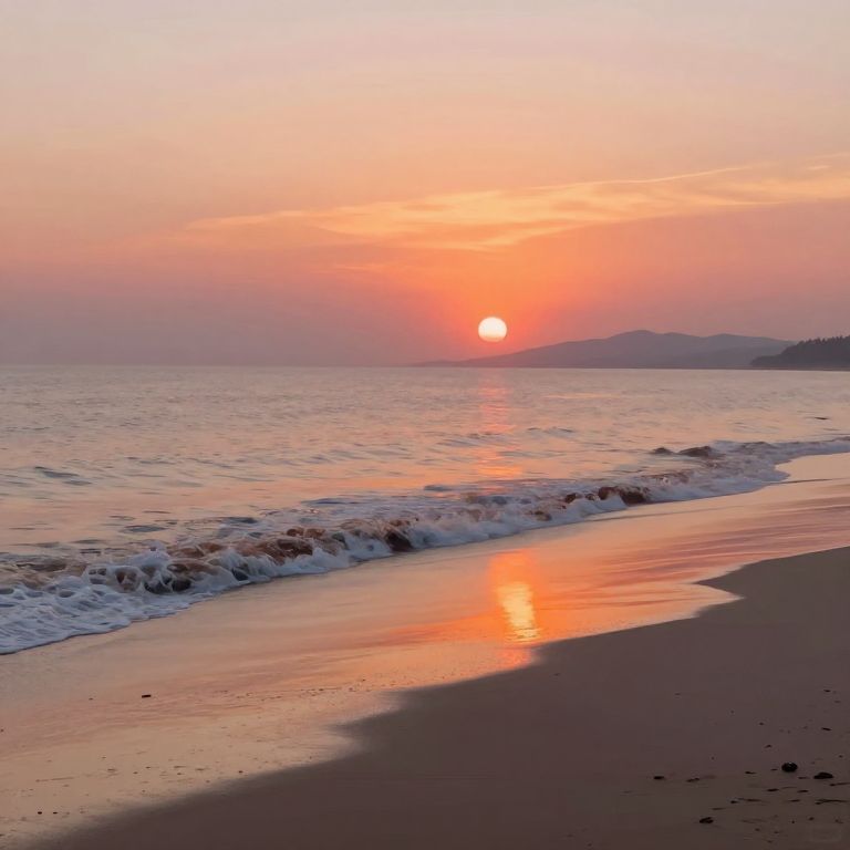 Fazit shown in a serene beach sunset scene, calm waves lapping the shore, warm orange and pink sky reflecting on wet sand, peaceful and contemplative mood, hyper-realistic digital painting with soft lighting.