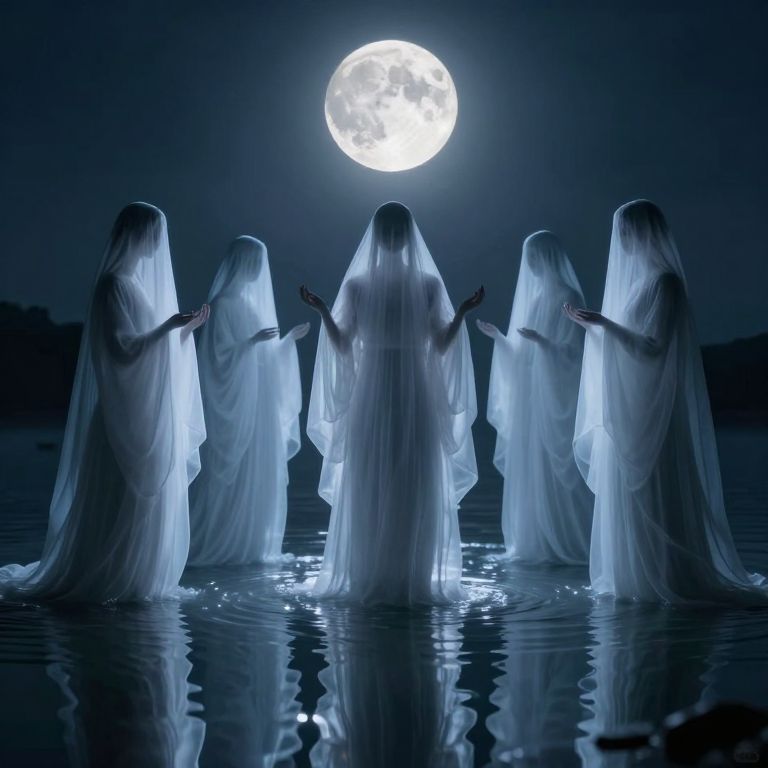 Phantom figures cloaked in ethereal light gather beneath a luminous moon, their spectral forms casting enigmatic reflections upon the tranquil waters below, as if conspiring in a nocturnal ritual unseen by mortal eyes.