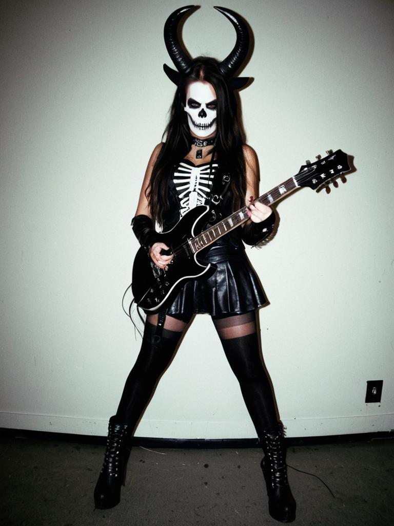 Girl rockstar costume, solo, 1girl, thighhighs, horns, long hair, skull, boots, choker, black thighhighs