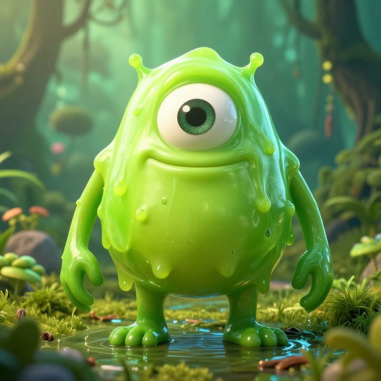 Sans Serif friendly big fat bright green slimey monster from a fantasy world in a swamp land, 8k, ultra realistic, 8k, unreal engine,