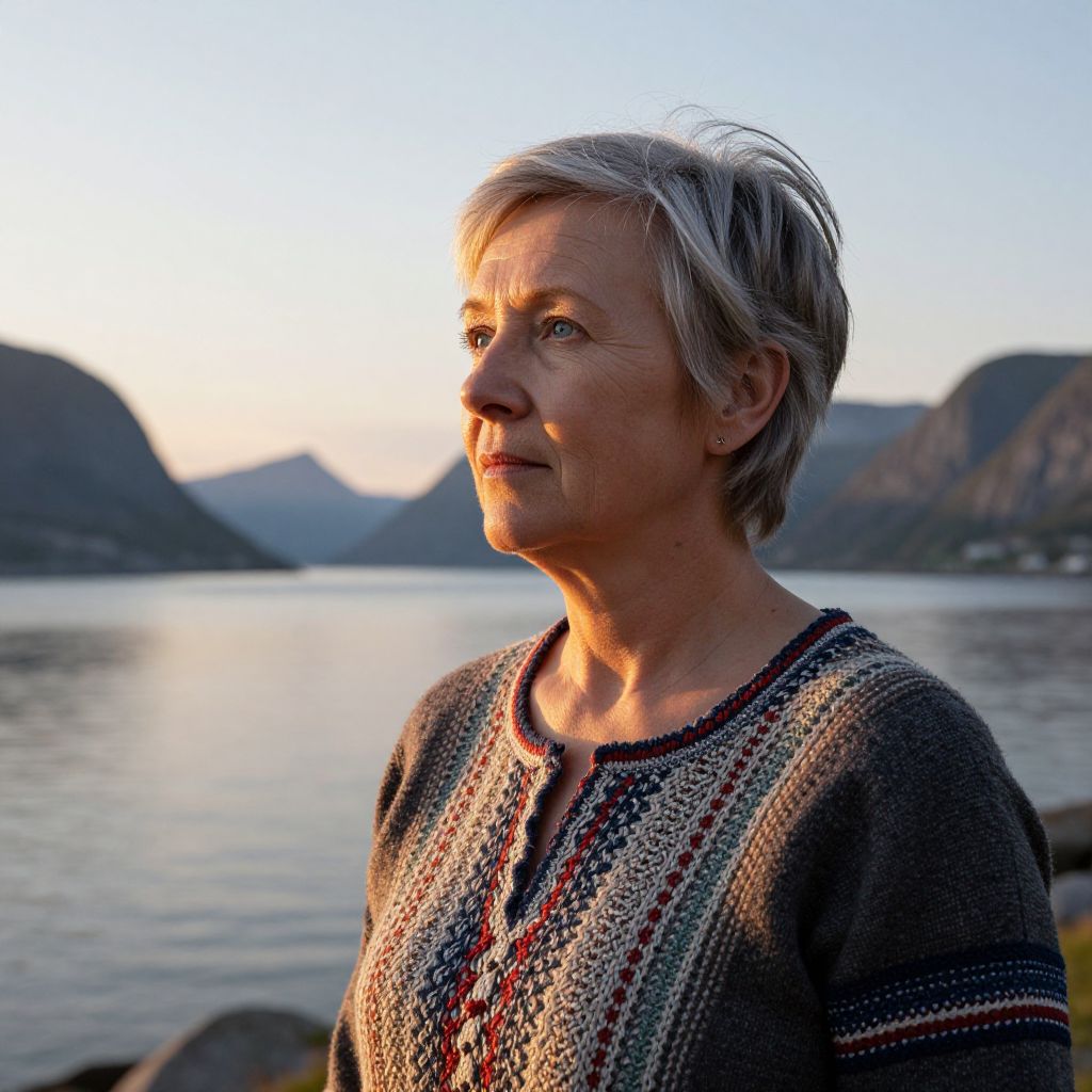 A middle-aged Slavic woman with deep blue eyes and delicate features stands resolute against a serene fjord landscape bathed in golden hour light. Her short hair, streaked with silver, frames an expression of determination mingled with serenity as she gazes towards the horizon, contemplating life's vast possibilities. The soft focus background and warm color palette create an ethereal atmosphere, drawing attention to subtle details like the creases around her eyes and the intricate texture of her attire woven from local materials. This composition, evocative of classic Scandinavian photography techniques, invites viewers to connect with her emotional state and sense of place within this breathtaking environment.