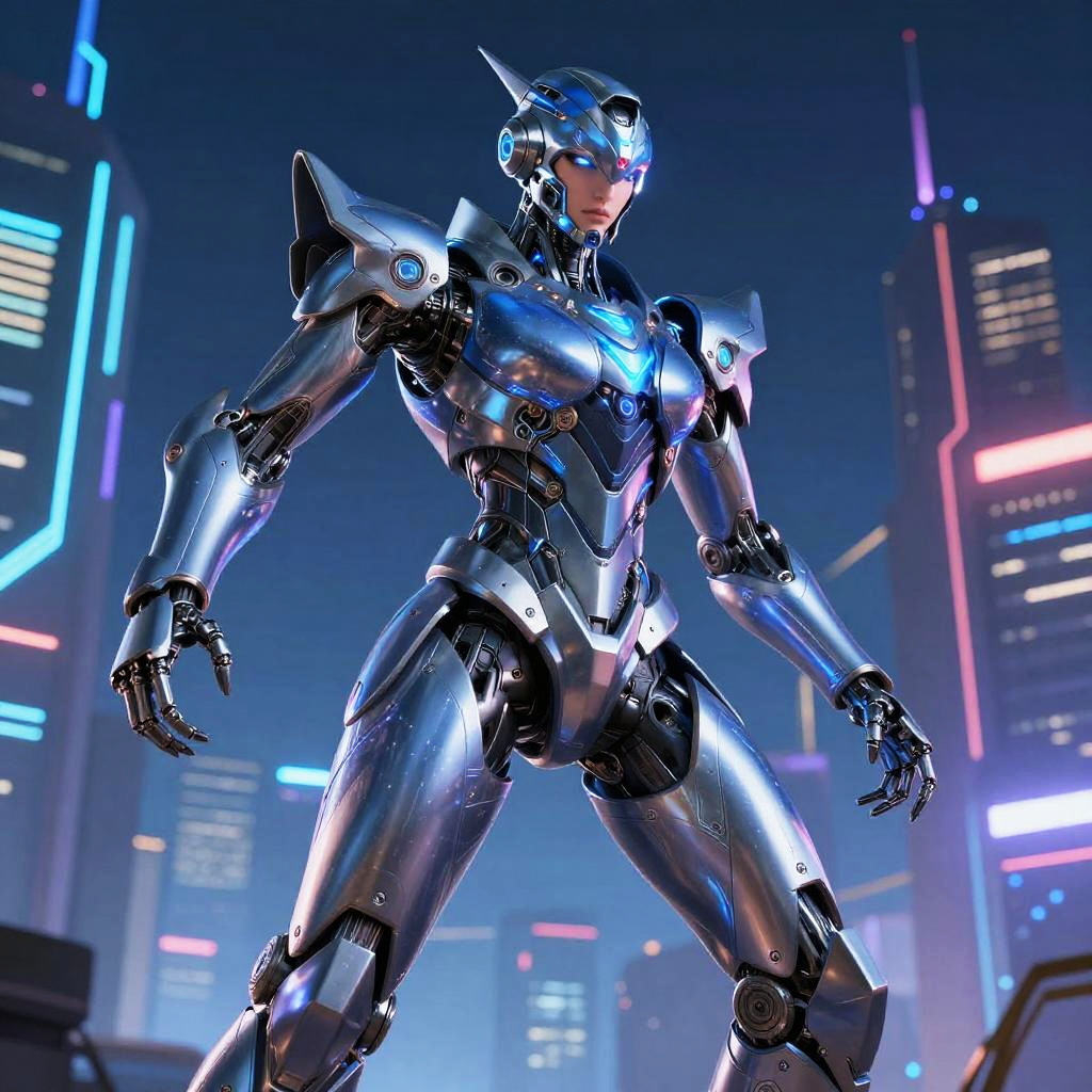 Ikiris, a futuristic cybernetic warrior with sleek armor, glowing blue and silver tones, neon cityscape background at night, dynamic pose, intricate mechanical designs, digital art, sci-fi theme, high-tech environment
