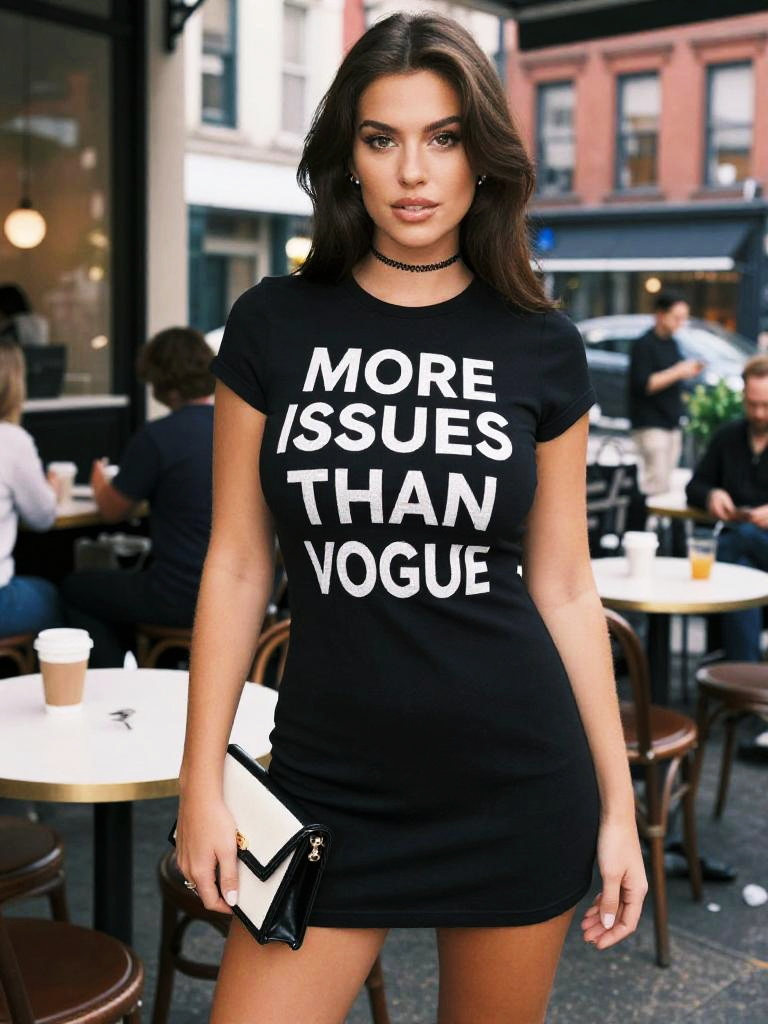 Photograph of a young woman with long, wavy brown hair and light brown eyes, standing in an urban outdoor café. She wears a tight, short-sleeved black dress with bold white text reading "MORE ISU THAN VOQUE." She holds a black and white clutch in her right hand and has a black choker necklace. The background shows blurred café patrons, wooden chairs, and tables with white cups. The setting includes brick buildings and bright streetlights, suggesting a bustling city environment. The image has a slight digital enhancement effect, emphasizing the text and the woman's features.