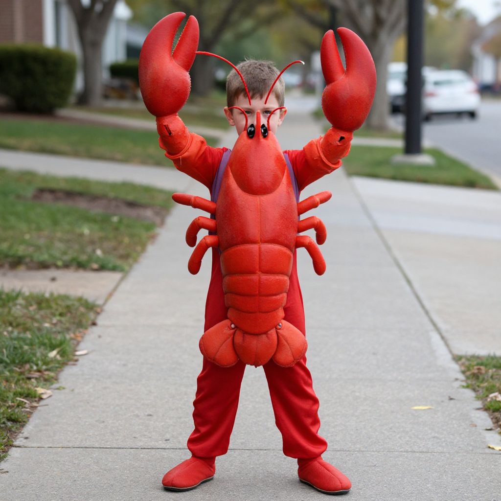 Photograph of a young boy in a bright red lobster costume with oversized claws, standing on a suburban sidewalk.