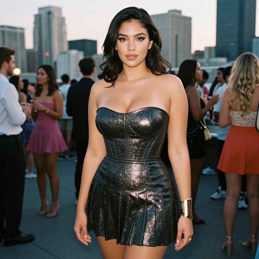 A curvy woman in a metallic shimmer strapless mini dress with a fitted bodice and pleated skirt stands at a vibrant urban rooftop party, adorned with a gold cuff bracelet. Visual style: cri film. Sexy. Pretty face and beаutiful eyes. Big breasts.