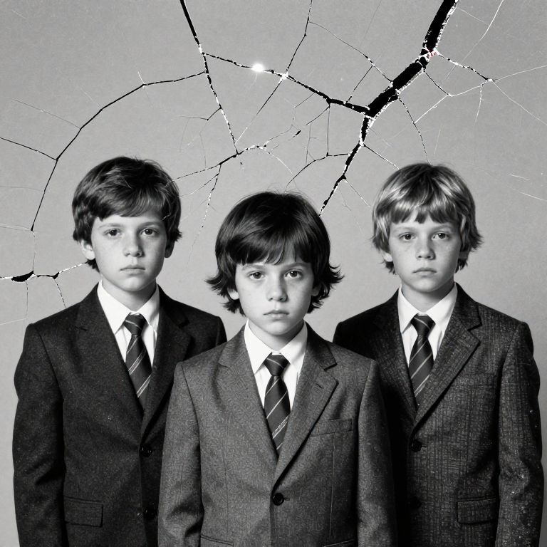 Black and white photograph of three young boys with similar facial features and short, slightly messy hair, standing in a row. They wear dark, textured, plaid suits with white shirts and striped ties. The background is a plain, light gray wall with a large, irregular crack spreading across it. The boys' serious expressions create a somber mood. The image has a vintage, slightly grainy texture, emphasizing the contrast and depth of the crack and their formal attire.