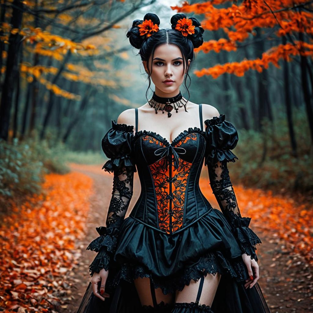 Halloween black top hat, photorealistic, woman standing in autumn park, black Victorian-style dress, strapless with ruffled layers, black knee-high socks, black Mary Jane shoes, black top hat with feather, long wavy black hair, serious expression, background: path lined with trees with orange-yellow leaves, fallen leaves on ground, overcast lighting, slightly blurred background, fall setting, gothic fashion, detailed ures, realistic shadows, symmetrical composition, full body shot, centered, natural light
