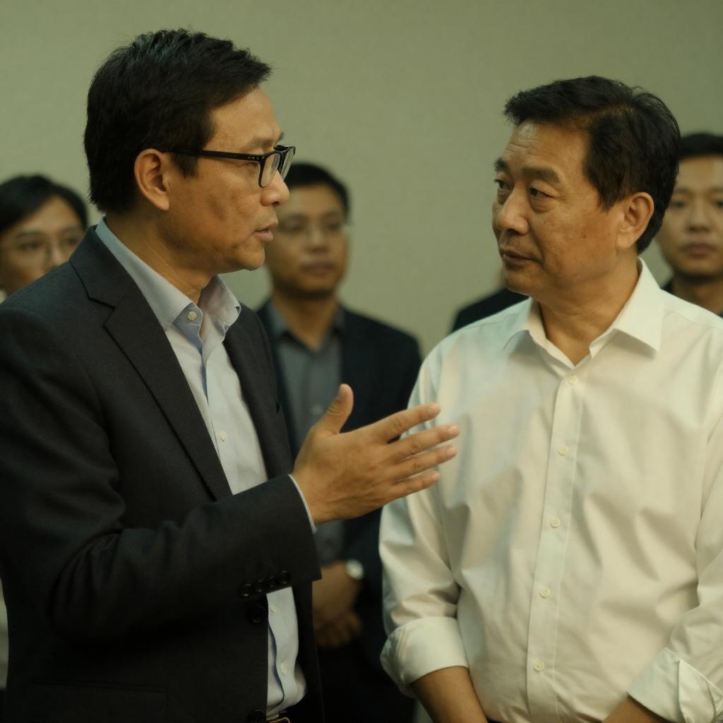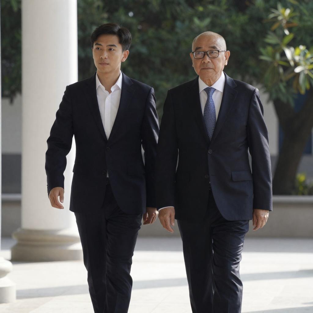 Photograph of four men walking in a dimly lit, carpeted hallway. The central man, with light brown hair, wears a gray blazer over a blue shirt. Flanked by two tall, bald men in black suits and white shirts, and a shorter man in a black suit with a white shirt. Background includes blurred lights and a golden wall.