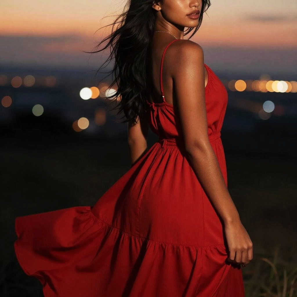 Red dress on dark skin, outdoor evening scene with glowing city lights blurred in the background, the dress flowing in the gentle breeze, natural skin tone shining under ambient light, bohemian elegance, photorealistic style with warm color grading.