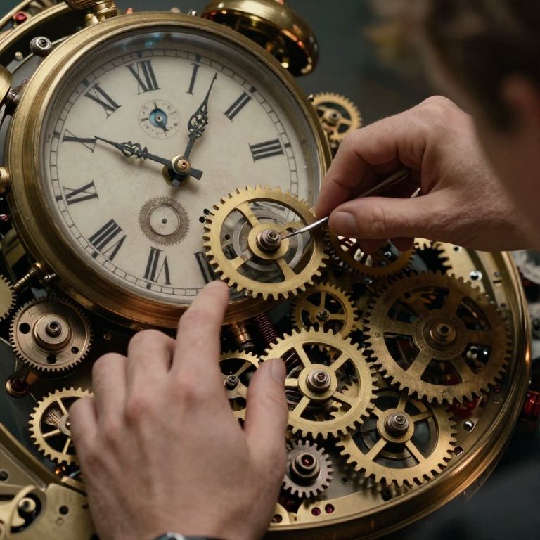 A surreal image depicting a cybernetic clockmaker in a dreamlike setting, showcasing an intriguing blend of futuristic technology and vintage timepieces. The scene is viewed from an unusual angle, highlighting the intricate details as both mechanical elements and biological components intertwine seamlessly. With delicate precision, the clockmaker's fingers manipulate gears, springs, and cogs, creating a sense of awe at the harmonious balance between order and chaos in this captivating, enigmatic fusion of past and future.