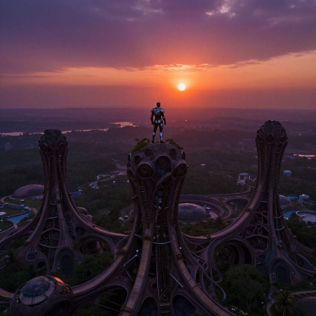 A digital artwork depicts a futuristic, sci-fi scene at sunset. A figure in a silver spacesuit stands triumphantly on a high, complex structure with numerous twisting, mechanical arms. The sun sets in a vibrant orange and purple sky, casting a warm glow over the landscape below. The structure is intricately detailed with circular and arching elements, resembling a mix of industrial and organic designs. In the background, a sprawling cityscape is visible, with small buildings and roads. The overall color palette includes deep purples, oranges, and silvers, creating a dramatic, otherworldly atmosphere. The perspective is aerial, emphasizing the grandeur and scale of the scene.