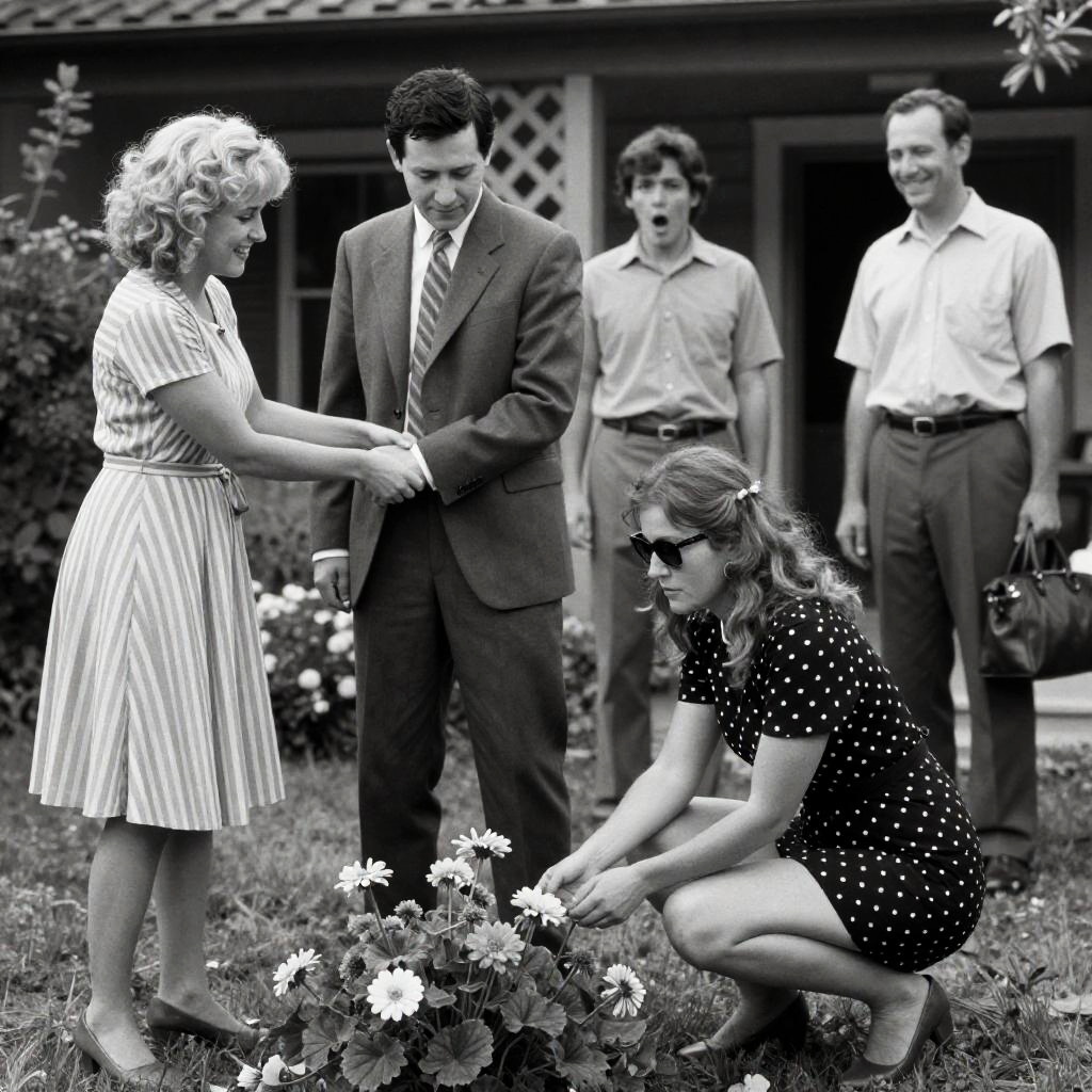 Black and white vintage photograph featuring a group of men wearing suits and fedora hats surrounding a woman sitting on the ground. The woman, dressed in a mid-century style dress, holds a young boy lying unconscious or asleep in her lap. One man in a suit and hat is bent over, closely observing the boy. The image portrays concern and attentiveness in a mid-20th century setting.