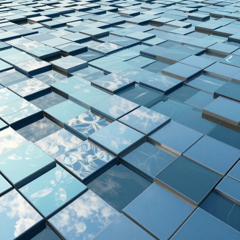 Photograph of a modern, reflective, blue-tinted glass tile wall with cloud and sky reflections, arranged in a geometric pattern.