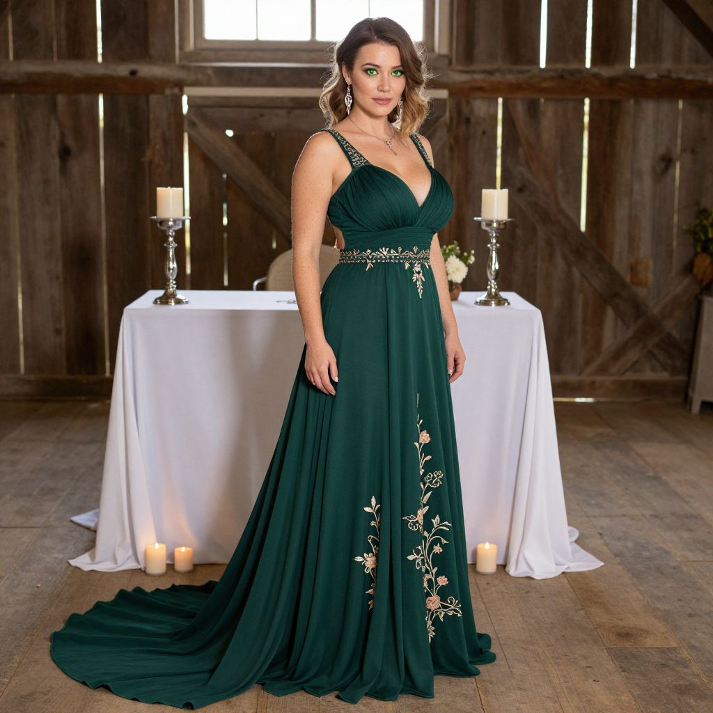 Photograph of a curvy woman with light olive skin and wavy, shoulder-length brown hair standing in a rustic wooden barn. She wears a dark green, sleeveless, V-neck gown with a flowing skirt adorned with delicate white floral embroidery near the hem. The gown is cinched at the waist with a sparkling belt. Behind her is a white-covered table with two tall, white candles on either side, and a small bouquet of white flowers. The barn's wooden walls and floor add a warm, rustic charm to the scene. The woman's makeup is subtle, emphasizing her green eyes, and she wears a delicate necklace.