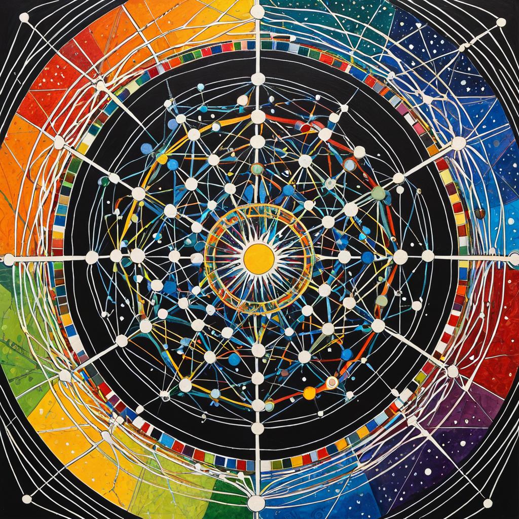 Drone Technology Galaxy, alien sage inside fibonacci spiral, mobius strip, abstract colored lines and drops, fluid paint drips, black background, by Gustav Klimt, by Vincent Van Gogh, by Gerhard Richter