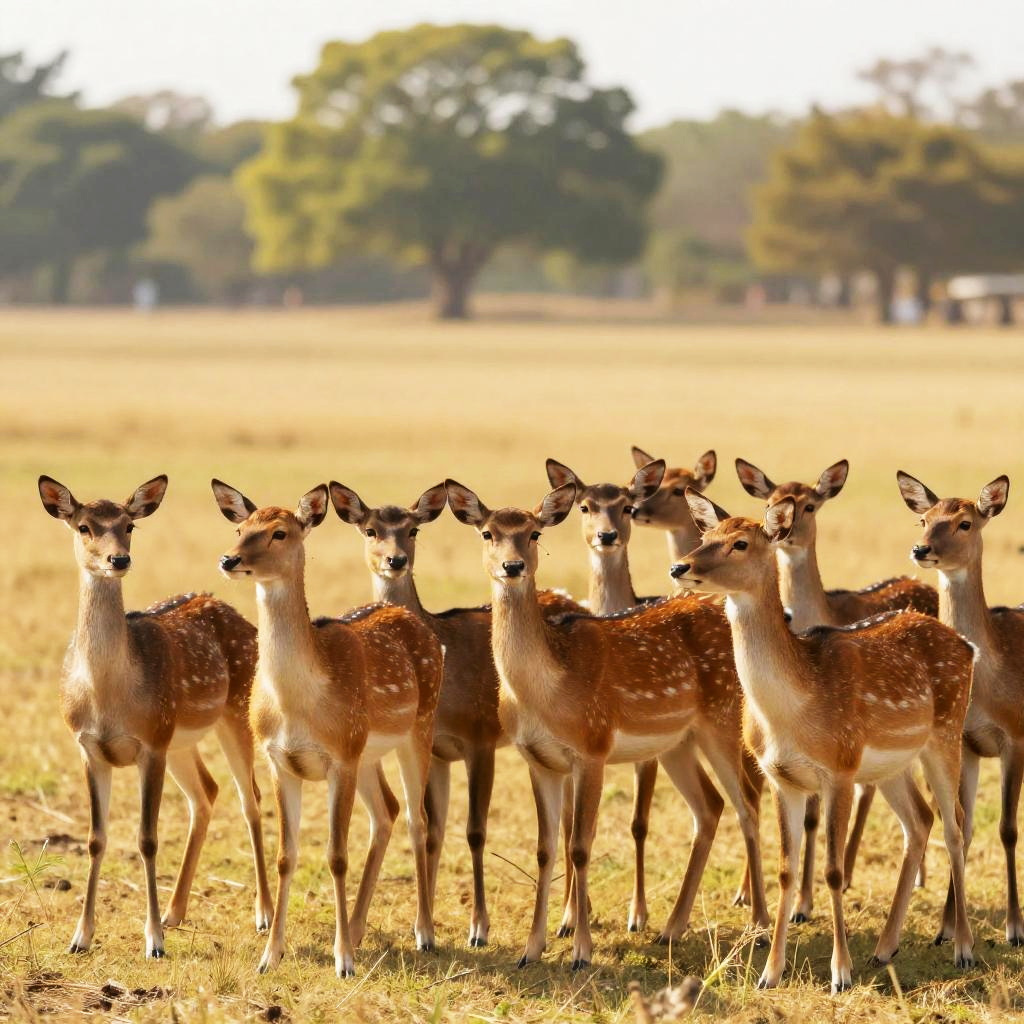 Photograph of a group of nine deer standing closely together in a sunlit, golden-yellow grass field. The deer have reddish-brown coats with white underbellies and are all looking in different directions. The background is slightly blurred, showing a line of green trees under a bright, clear sky. The image has a warm, vibrant color palette.
