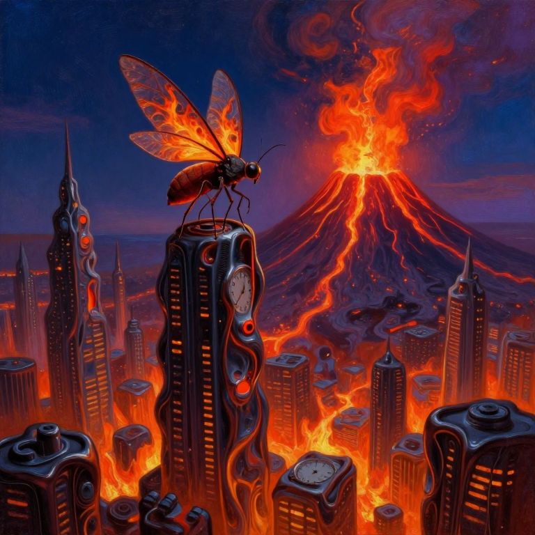 Craft an oil painting brimming with surrealism, drawing inspiration from melting timepieces to depict a futuristic cityscape dominated by skyscrapers sculpted from molten metal. These structures should flow like liquid against the backdrop of an erupting volcano, viewed from a unique 'bug's-eye view' perspective that showcases intricate details of a small insectoid creature perched atop one of these skyscrapers. The creature's delicate wings reflect volcanic flames and lava, creating mesmerizing patterns that evoke both awe and fear, blending surreal beauty with impending danger as the natural disaster looms below. Utilize a color palette featuring fiery oranges and reds from the volcano juxtaposed against cool blues and purples of the night sky, establishing an emotional gradient that captures the intensity and unpredictability of this apocalyptic vision.