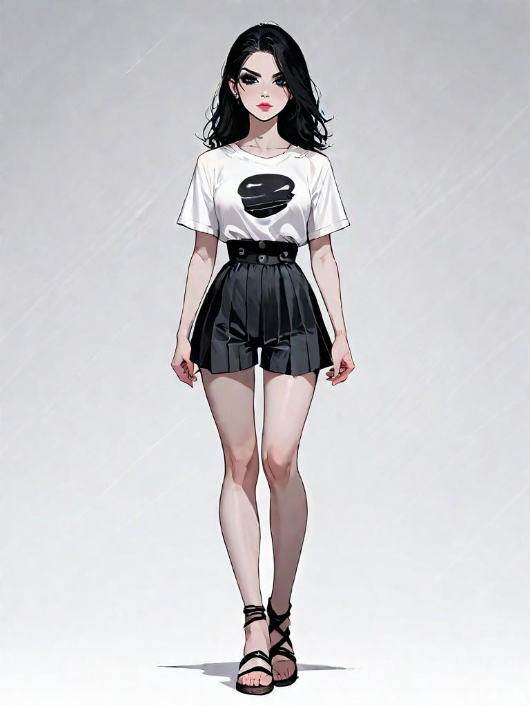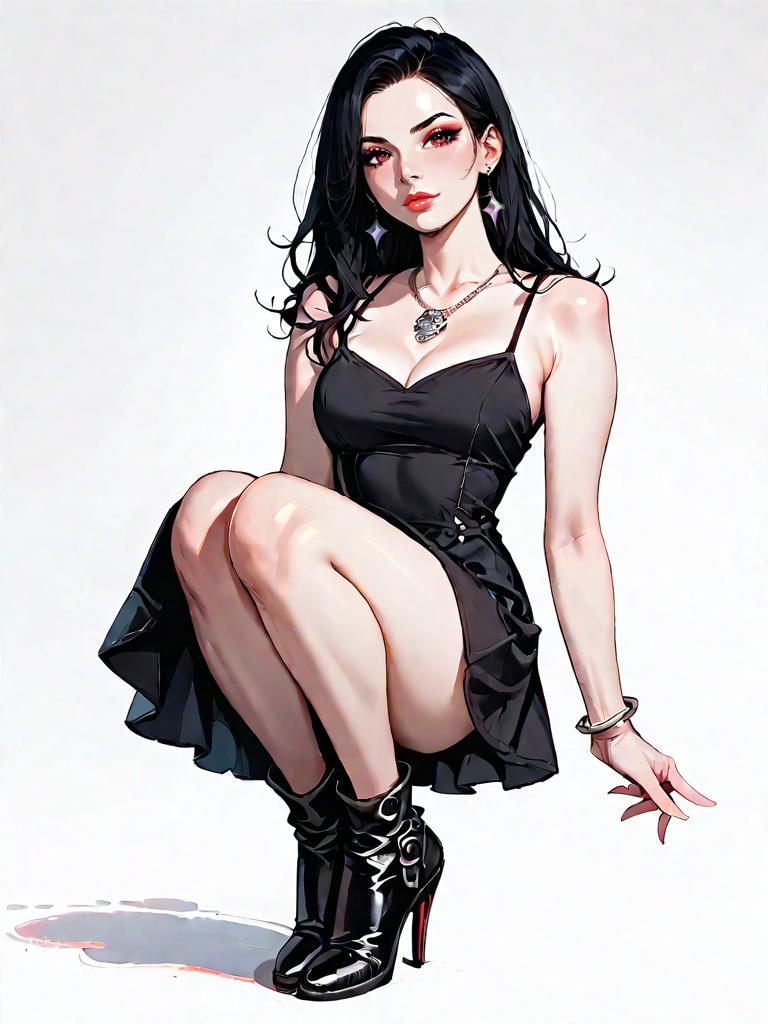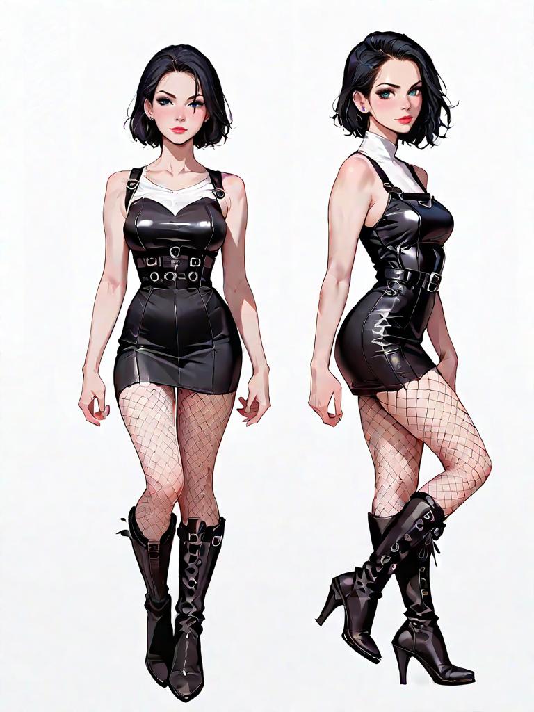 1girl, source_comics, realistic face, full body shot, Woman, minimalist chic, strapless mini dress in a vibrant teal color, straight neckline, fitted silhouette, subtle ruffle at the hem, paired with white strappy heels, plain white background.