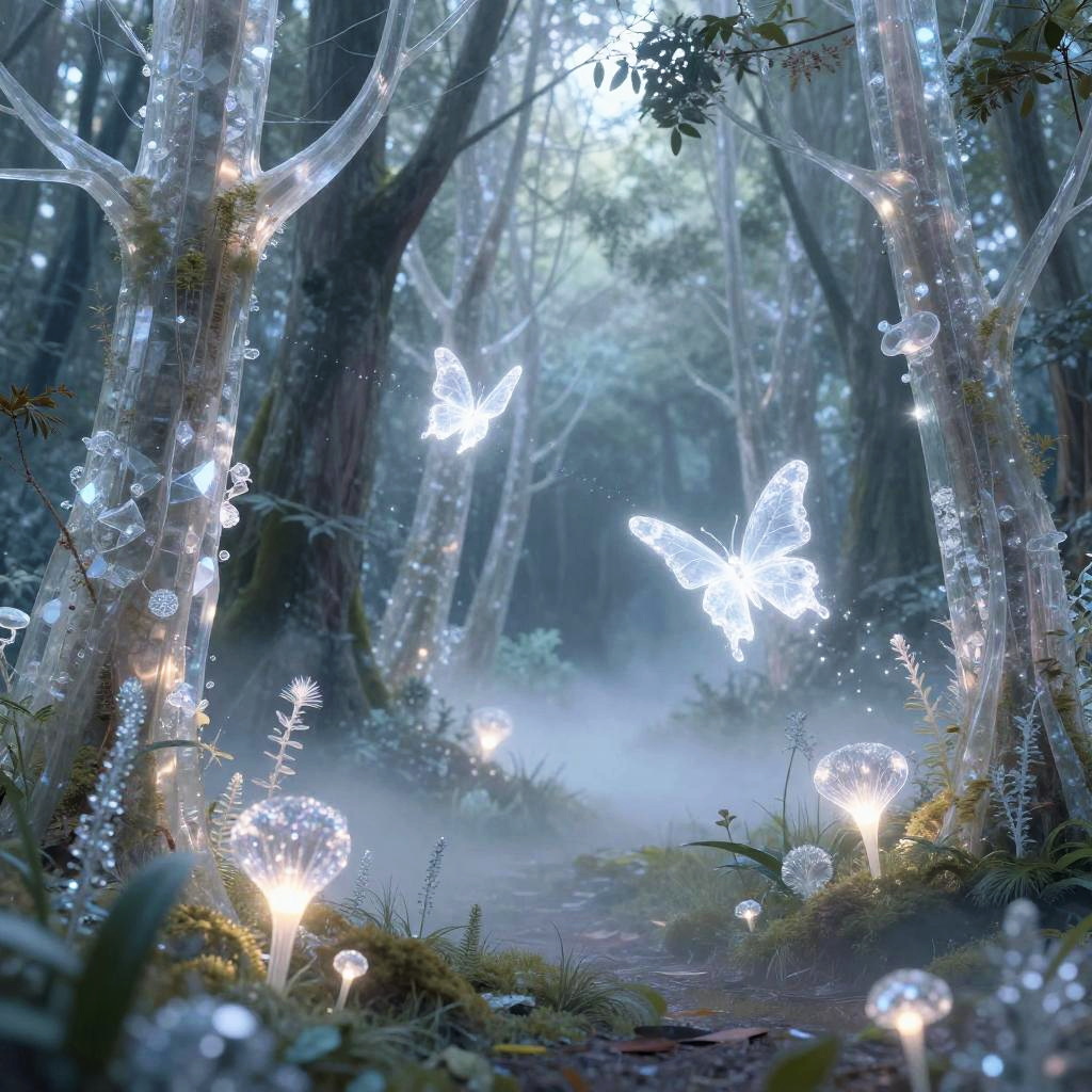 AI generated artwork depicting a dreamlike forest featuring translucent crystalline trees and glowing bioluminescent plants. The scene includes a mysterious fog swirling along a forest path and luminous digital butterflies composed of light particles gently flying, creating a peaceful and futuristic fantasy atmosphere.