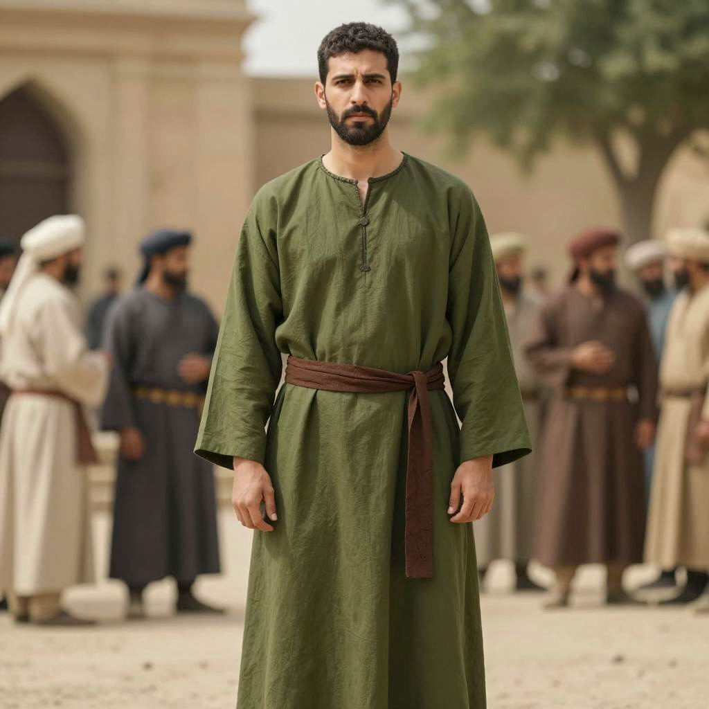 Man general costume, photograph of a man standing outdoors, wearing a long, olive-green robe with a brown belt, short dark hair, trimmed beard, serious expression, background with blurred people in traditional clothing, stone building, green trees, daytime, realistic style, historical setting, slightly warm light, natural colors, casual pose, full body shot, centered, slightly shadowed face