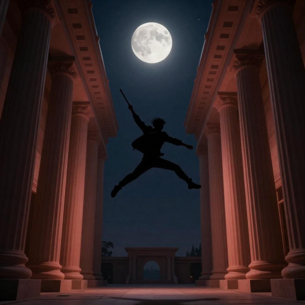 Digital artwork of a person in mid-air, leaping between two tall, ancient-style buildings under a starry night sky with a bright full moon. The buildings have classical columns and a warm, reddish glow on the right. The leaper is silhouetted, wearing dark clothing and holding a staff.