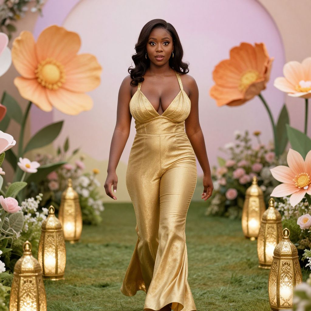 A cinematic shot of a woman with deep brown skin and expressive, wide-eyed brown complexion wearing a luxurious gold flared jumpsuit, walking through a themed garden with oversized flowers and golden lanterns, the costume standing out with elegance and vivid contrast against the pastel backdrop.. The woman has big breasts and cute face