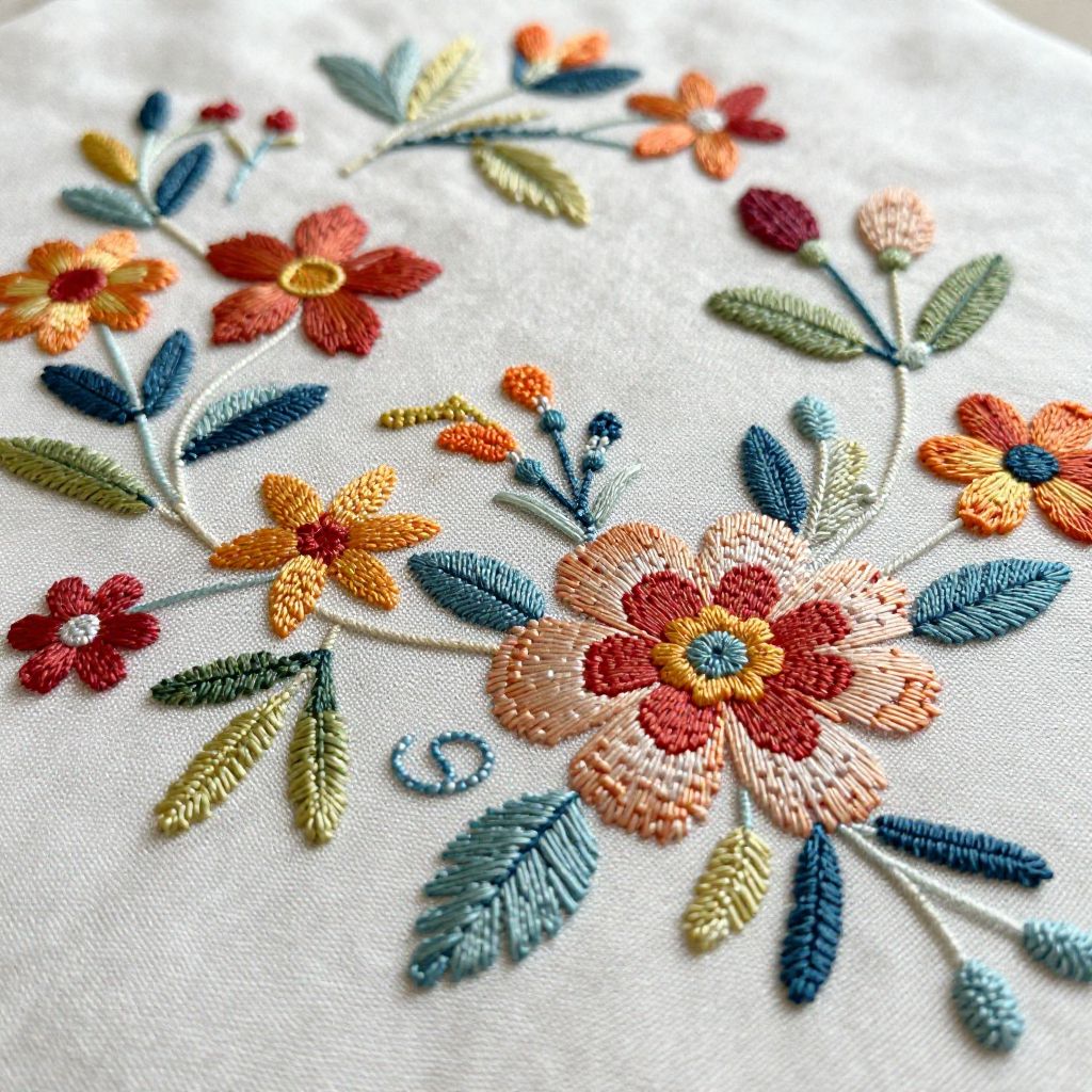 Close-up photograph of vibrant, detailed embroidery with red, orange, and yellow flowers, blue and green leaves, and textured stitches on white fabric.