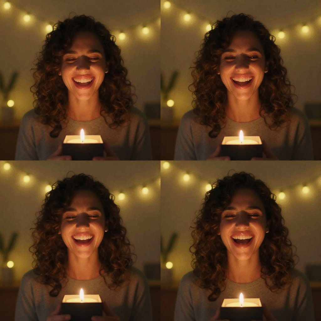 Photograph collage of a smiling woman with curly brown hair, medium skin tone, and wearing a gray shirt, holding a lit candle in front of her chest. Four identical images are arranged in a 2x2 grid. The background is softly lit with warm yellow string lights, creating a cozy atmosphere. The woman's bright, wide smile and closed eyes are the focal points, with the candle's flame casting a warm glow on her face. The blurred background includes a potted plant, adding to the homely setting. The image exudes warmth and happiness.