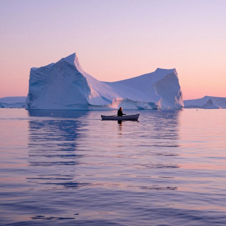 A serene, impressionistic scene unfolds with an expansive ocean stretching towards the horizon, its surface rippling under the gentle touch of a soft breeze. Towering icebergs cast elongated shadows across the water, reminiscent of Monet's luminous brushstrokes in his Water Lilies series. A solitary rowboat emerges from behind one of these frozen giants, carrying an individual bathed in ethereal light that highlights their features and reflects off the mirror-like surface. This evokes a sense of solitude, hope, and wonder as the viewer contemplates the figure's journey. As the sun sets behind the icebergs, it casts warm hues of pink and lavender across the scene, enveloping everything in a serene glow that invites introspection amidst the tranquil beauty.