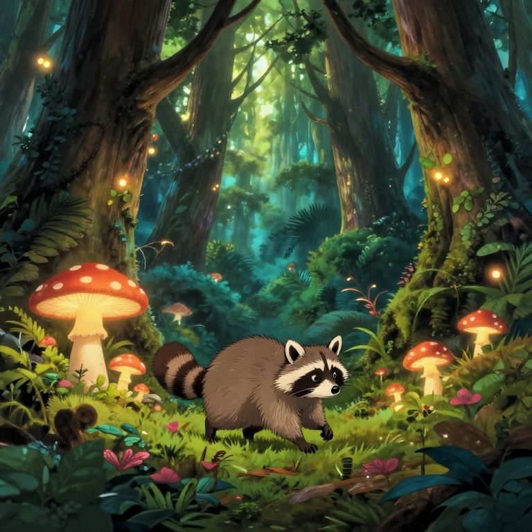 Envision an enchanting scene reminiscent of Studio Ghibli's whimsical universe, where a dense ancient forest teeming with towering trees and luminous mushrooms casts an ethereal glow from a peculiar perspective akin to a 'bug's-eye view'. Amidst this magical landscape, a curious creature resembling a raccoon meanders gracefully, its plush fur harmonizing beautifully with the rich tapestry of vibrant foliage. As the gradient of emotions shifts from wonder to nostalgia, viewers are invited to immerse themselves in the intricate details of this surreal environment and forge an intimate connection with our enigmatic protagonist as they navigate through the fantastical realm.