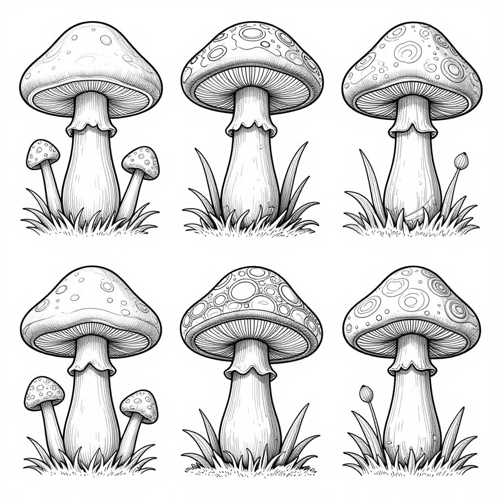 Metalness A set of fantasy mushroom coloring pages for adults, with detailed and intricate patterns,