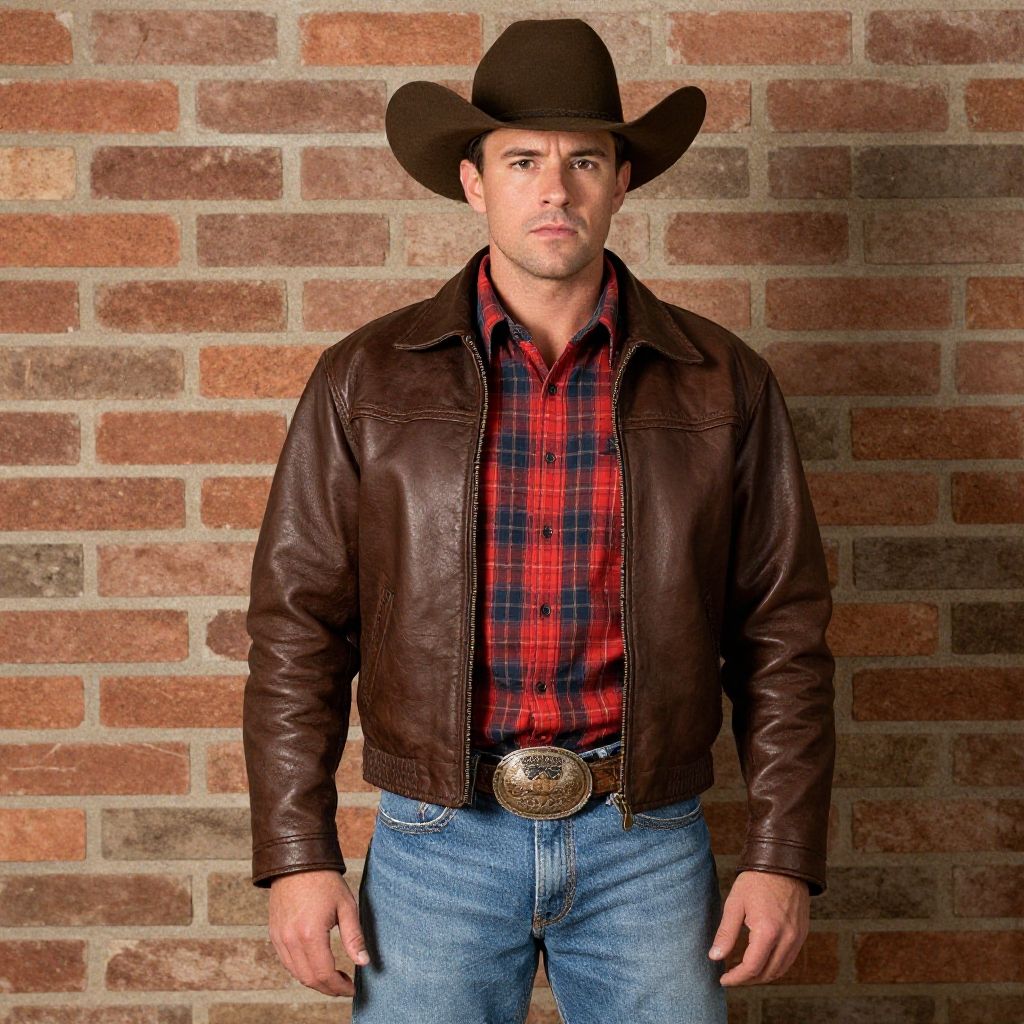 A man dressed as a cowboy wearing a brown leather jacket, brown cowboy hat, red plaid shirt, blue jeans, and a belt with a large buckle. He stands confidently against a rustic brick wall background.