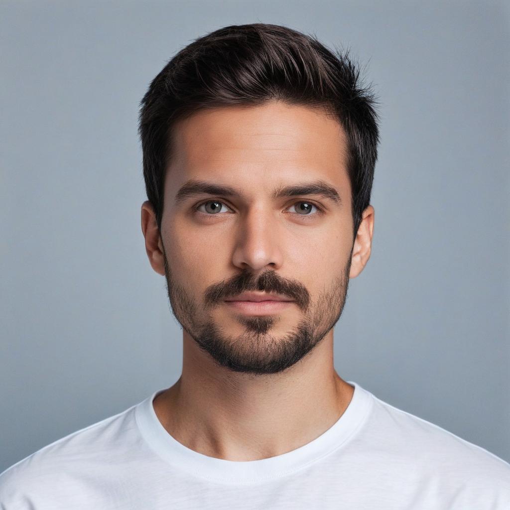 1boy, male focus, realistic, solo, facial hair, shirt, looking at viewer, white shirt, photorealistic, grey background, black hair, closed mouth, simple background, short hair, portrait, beard, blue eyes, upper body, brown hair, mustache, stubble, gradient background, black eyes, lips
