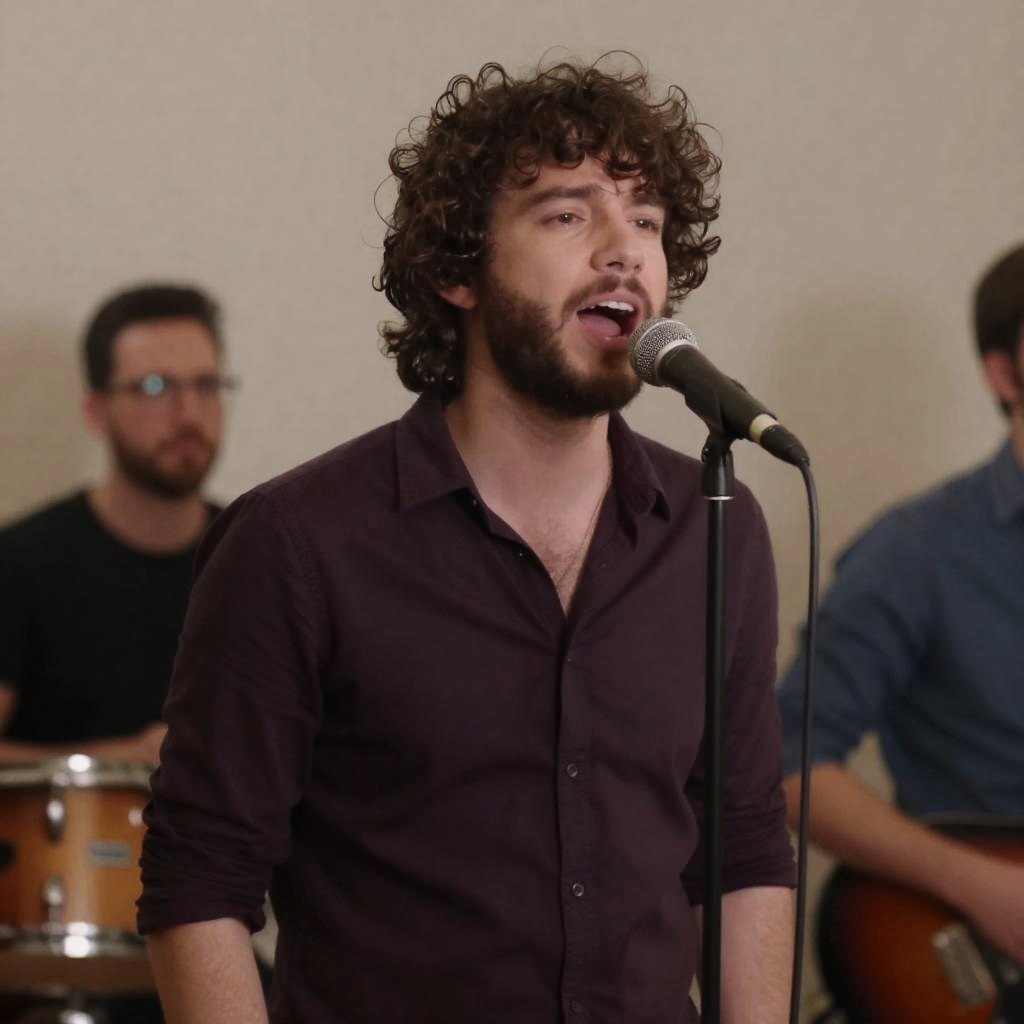 Photograph of a male singer with curly brown hair and beard, singing into a microphone with mouth open, wearing a dark purple shirt. In the background, a drummer wearing glasses and a man in a blue shirt are visible, accompanied by musical instruments. Warm indoor lighting sets a cozy atmosphere.