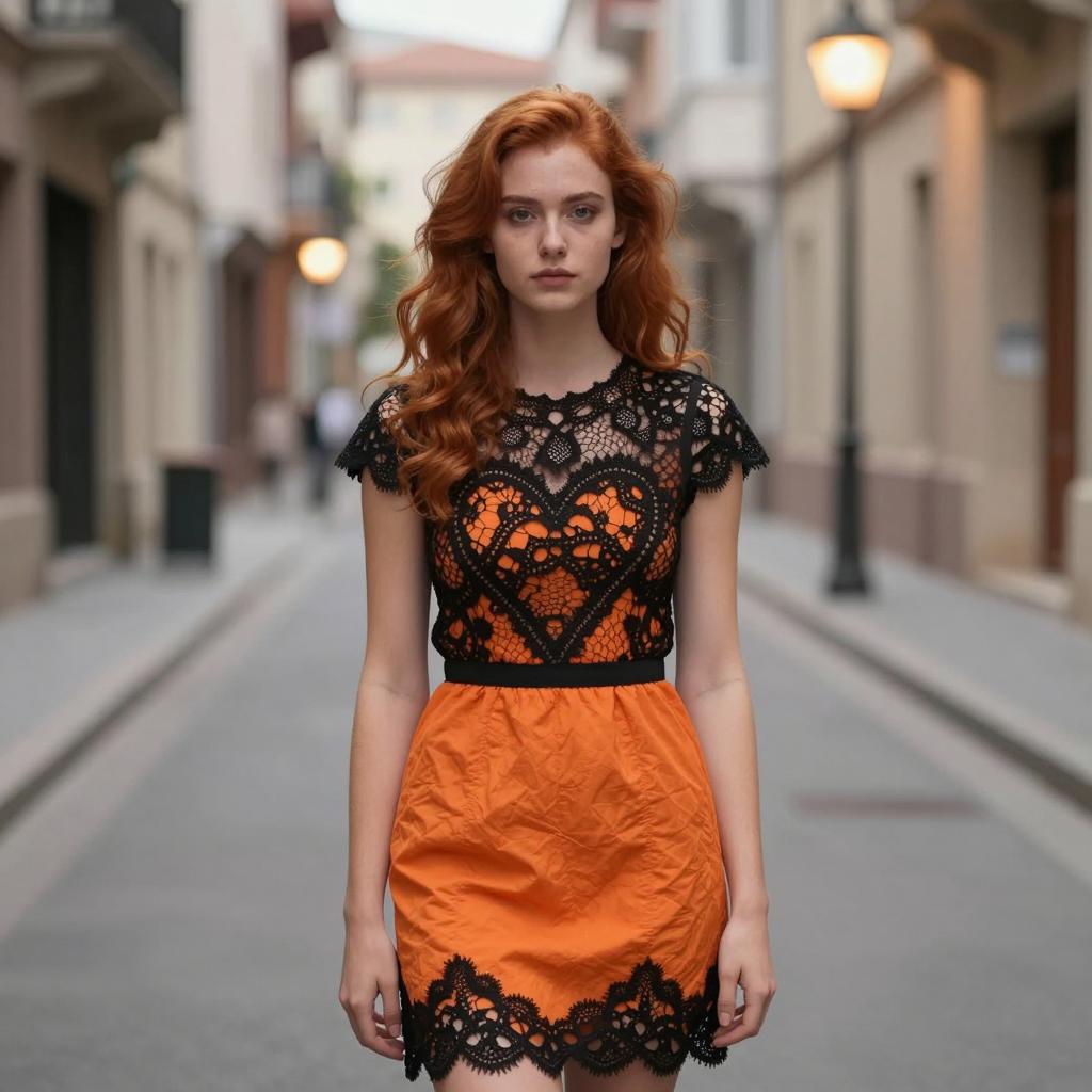 Orange black dress, photo of a young woman, red hair, wavy, black lace dress with intricate heart-shaped cutout, standing in a narrow urban street, blurred background, street lamps, warm lighting, daytime, realistic, portrait, full body, serious expression, natural light, detailed ures, bokeh effect