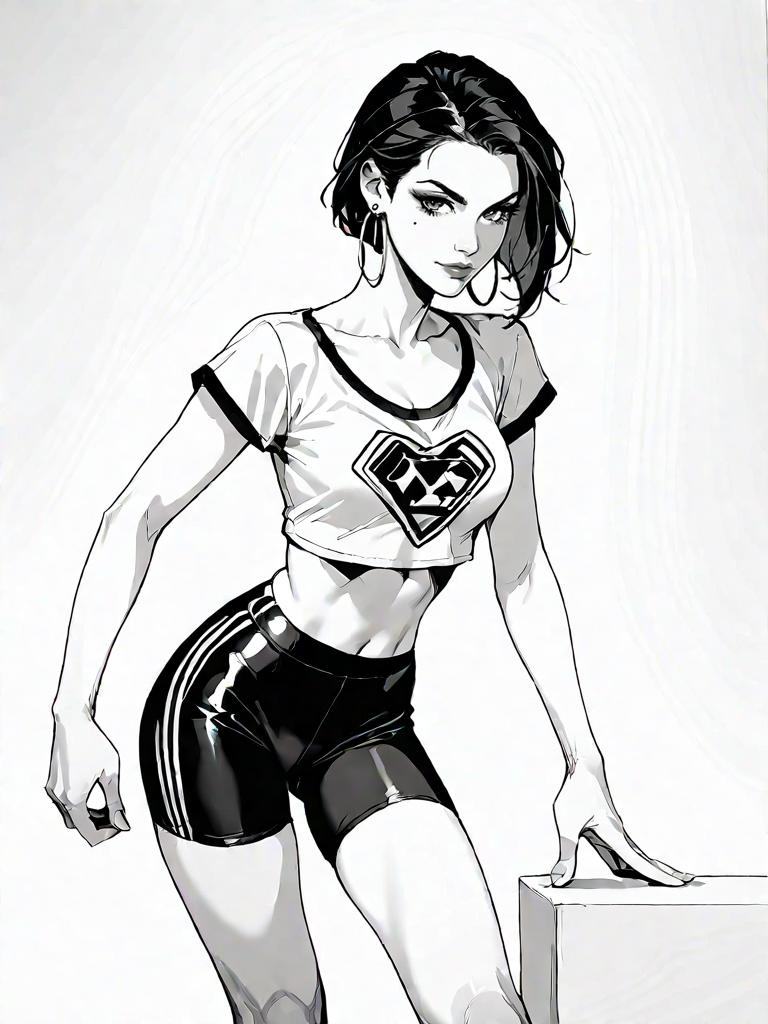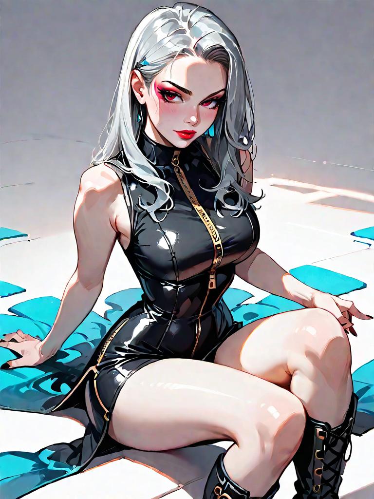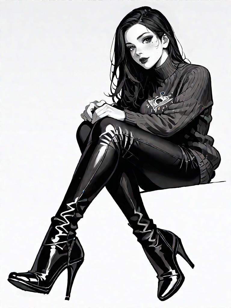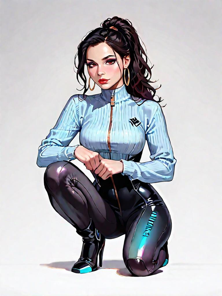 Digital illustration of a young woman with a realistic face, posing in a full-body shot against a white studio background. She wears a light blue ribbed zip-up top with long sleeves paired with glossy black leggings featuring a blue stripe and text detail. The woman has a sleek high ponytail, large hoop earrings, and black high-heeled boots with blue accents, embodying a modern, fashionable, and confident style.