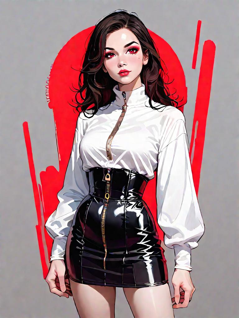 1girl, source_comics, realistic face, full body shot, Woman, bodycon style, ribbed dress in burgundy, round neckline with central zipper extending to the chest, long sleeves, fitted silhouette, mini-length, large hoop earrings, sleek high ponytail, white studio background.
