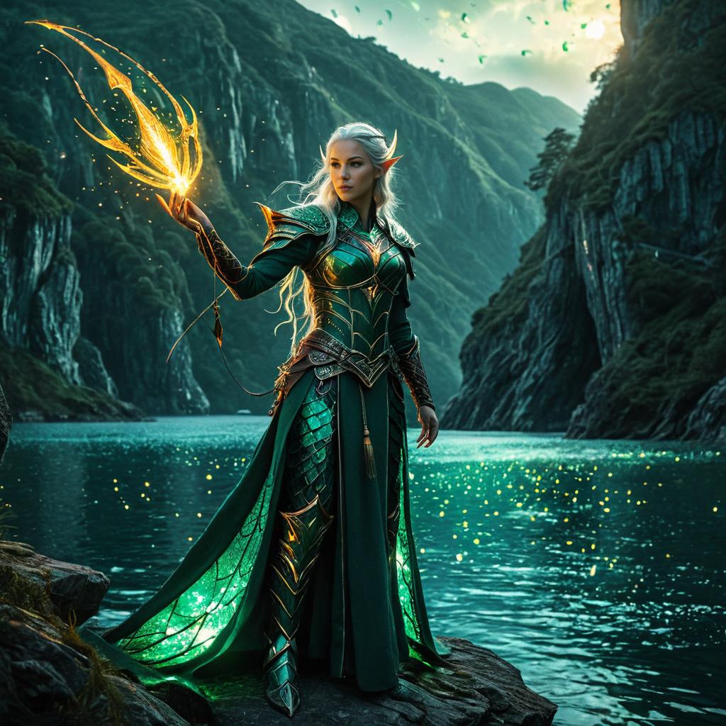 A fantasy scene featuring an elven sorceress standing on a rocky cliff beside a shimmering lake. She wears a sleek, green armored suit made from enchanted dragon scales, radiating a mystical glow. The sorceress conjures pulsating waves of golden-green fire with her outstretched hand. The background shows towering, forested cliffs with dancing fireflies illuminating the ethereal atmosphere. The image conveys magic, fantasy, and nature in harmony.