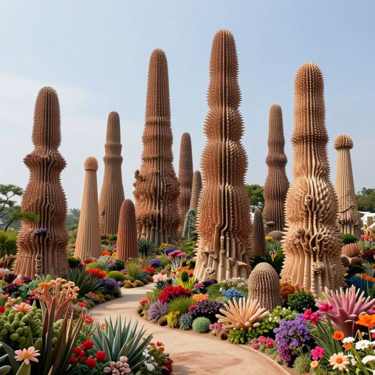 A surreal landscape where colossal, spiky towers resembling giant coral formations rise majestically from the earth, seamlessly integrated into a vibrant, blooming garden that defies conventional architectural norms.