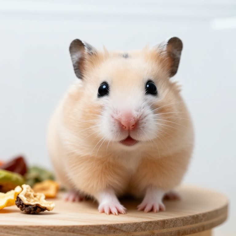 Close-up portrait of a hamster, a popular pet, with bright inquisitive eyes, soft pink nose, and tiny claws, sitting on a wooden platform in a bright, clean pet enclosure with some dried fruits and vegetables