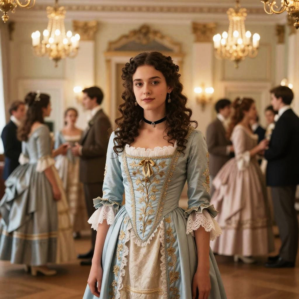 Photograph of a young woman standing in an opulent room. She wears a dark teal, intricately patterned, 18th-century-style dress with ruffled layers and lace trim. Her dark hair is styled up, adorned with a tiara, and she has a pearl necklace. The background features ornate gold mirrors, white walls, and gold-finished tables with white flower arrangements. Warm, ambient light fills the room.